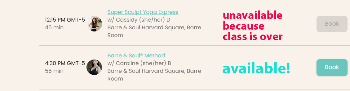 Click “book” to grab your spot in any class that’s available. Classes that have already occurred have gray buttons, classes that are in the future have teal buttons.